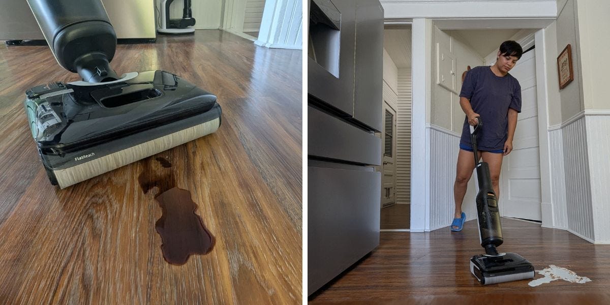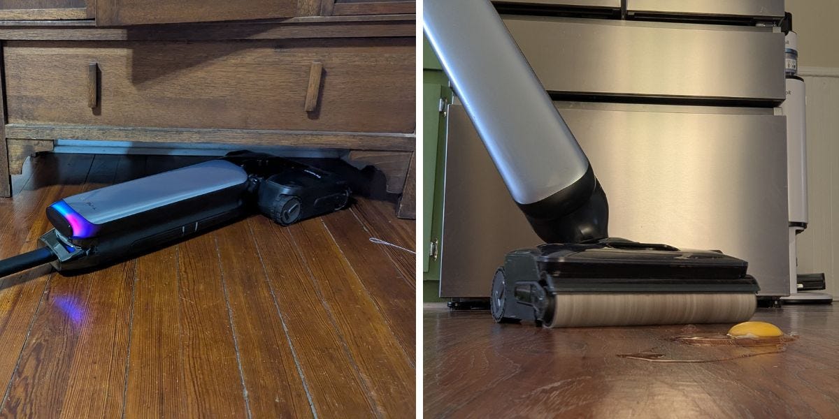 Dreame H15 Pro Carpetflex: I had high hopes for the Dreame H15 Pro Carpetflex, which has a hard floor cleaner brushroll and a separate vacuum-only design to swap in for cleaning carpets, but the suction level wasn't strong enough to make a meaningful impact on my rugs. The hot water self-cleaning and drying system is as impressive as the dirt detect technology. The vacuum will automatically adjust the suction when it recognizes dirt, debris, or a mess on the ground. Oddly, it didn't pick up thicker liquids, such as barbecue sauce, very well and struggled with extra-large debris. The front edge cleaning is also less than impressive, in that it is only able to clean within 1.5 inches of a wall.