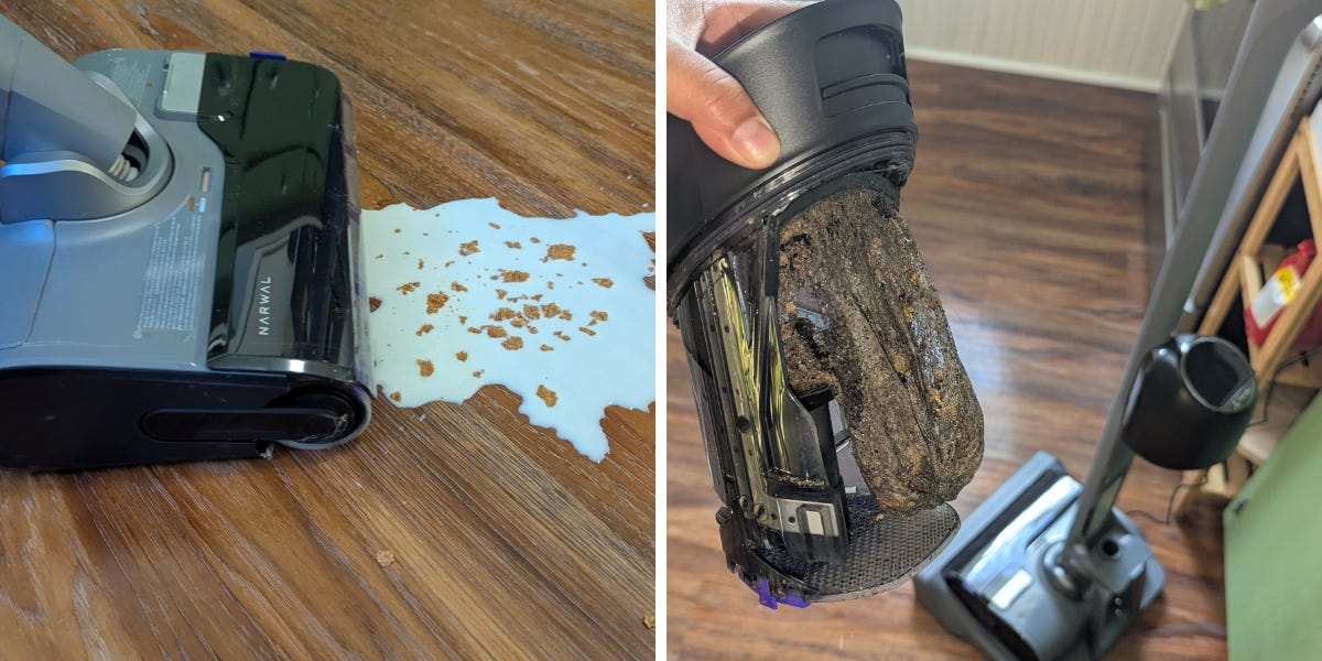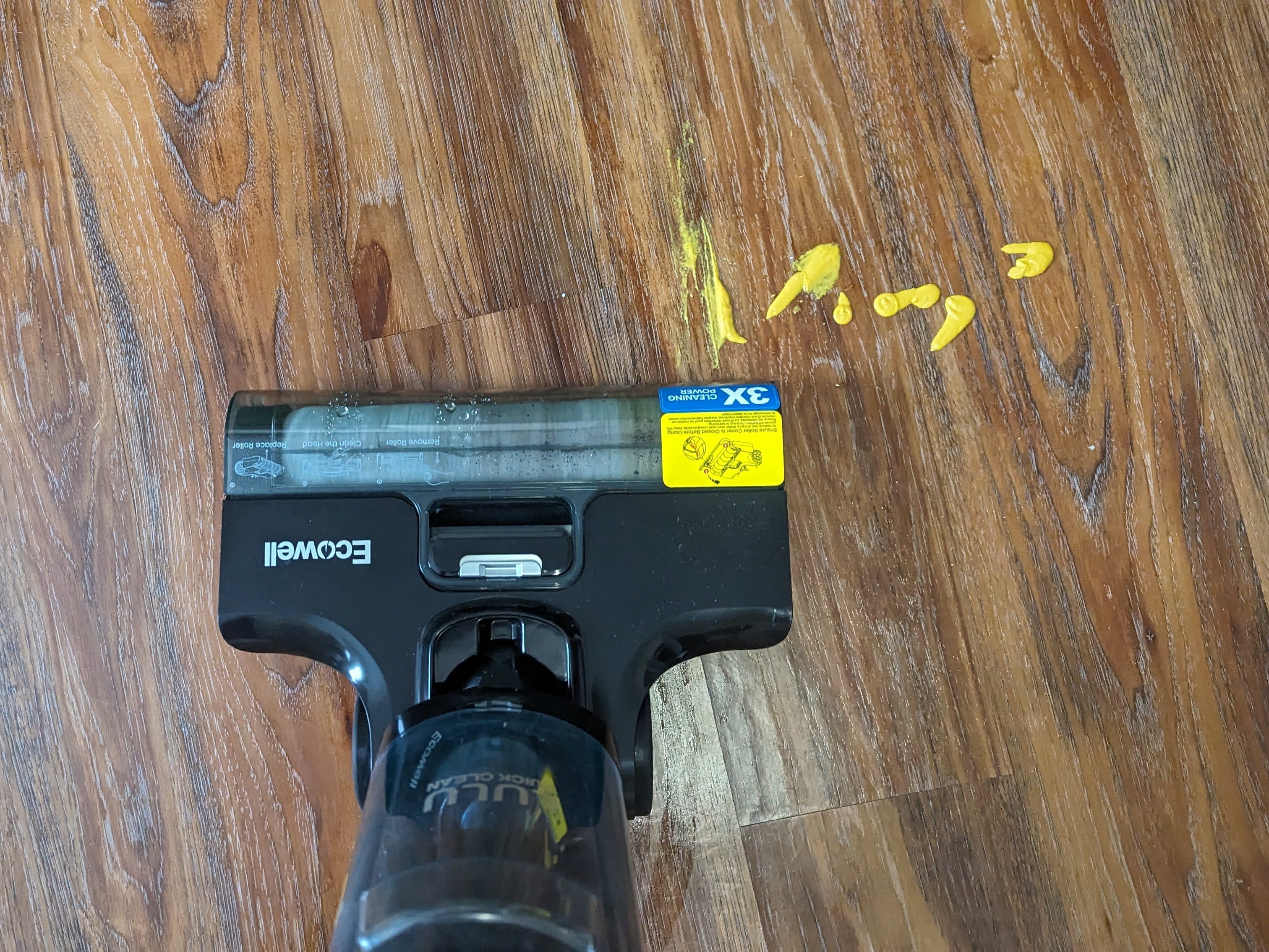 It aptly vacuumed and mopped away debris like leaves, hair, soda, and some bits of cereal on any floor type, but it struggled to clean thicker substances like barbecue sauce, syrup, and dried ketchup from hard floors. I had to go over these substances multiple times so there wouldn't be any leftover residue. I should note that coffee and larger debris like cereal often got caught behind the wheels when vacuuming backward.