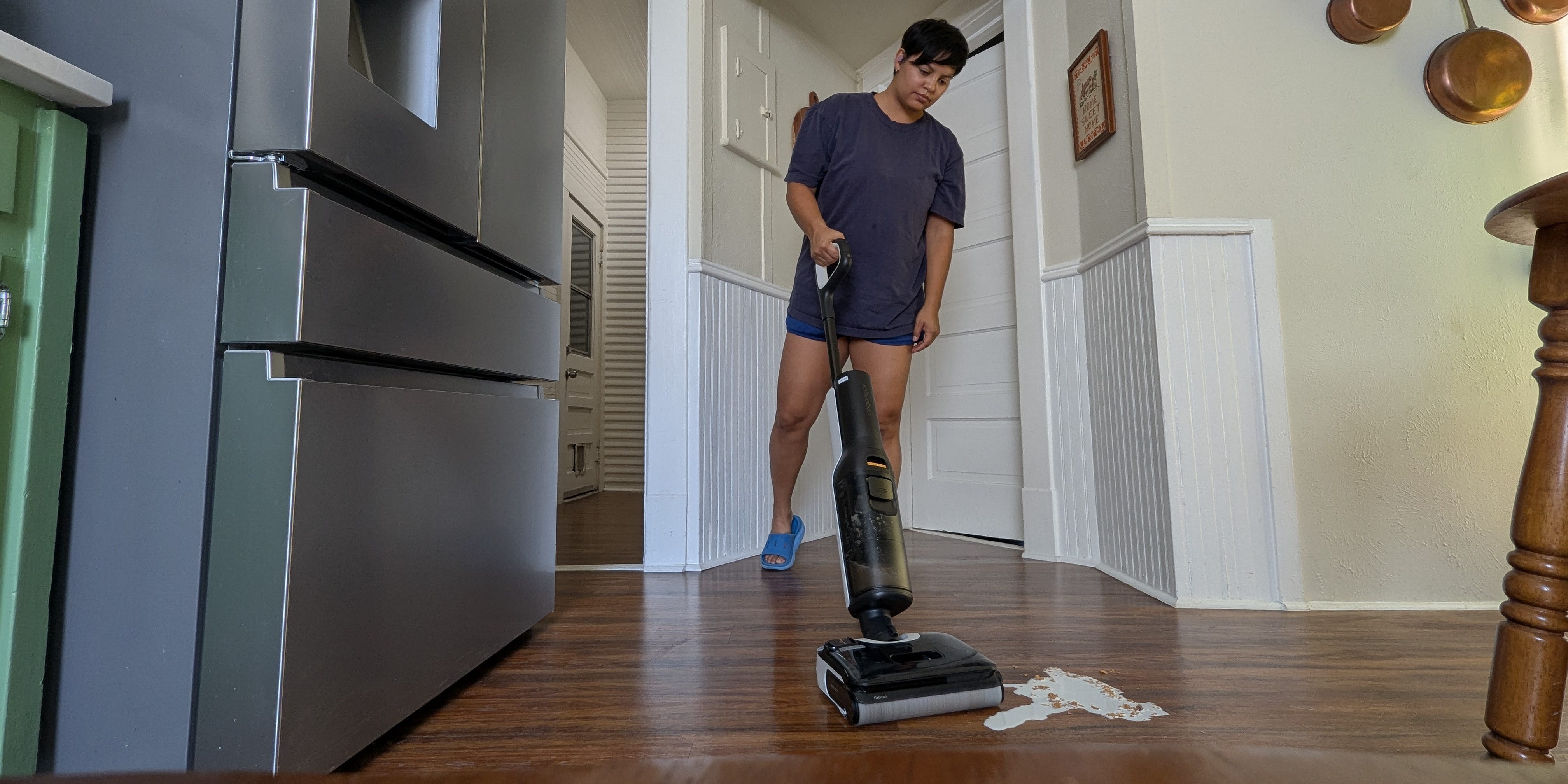 If only the vacuum head weren't so thick, which prevented it from fitting under my kitchen cabinet. Interestingly, the body of the wet-dry vacuum has a 90-degree swivel design, allowing me to twist around furniture as I cleaned. You'll typically only need one pass to pick up any type of wet or dry mess. A rubber scraper, which acts as a squeegee, in the floor head aids in a streak-free clean and picking up all manners of mess, while dual-edge cleaning ensures that there are no gaps between the sides of the vacuum and a wall or piece of furniture. I also didn't detect any space between the front edge of the vacuum and a wall when vacuuming straight on. If all that wasn't enough, dual-layer scrapers prevent hair from tangling around the brush and causing any clogs or interruption in your cleaning.