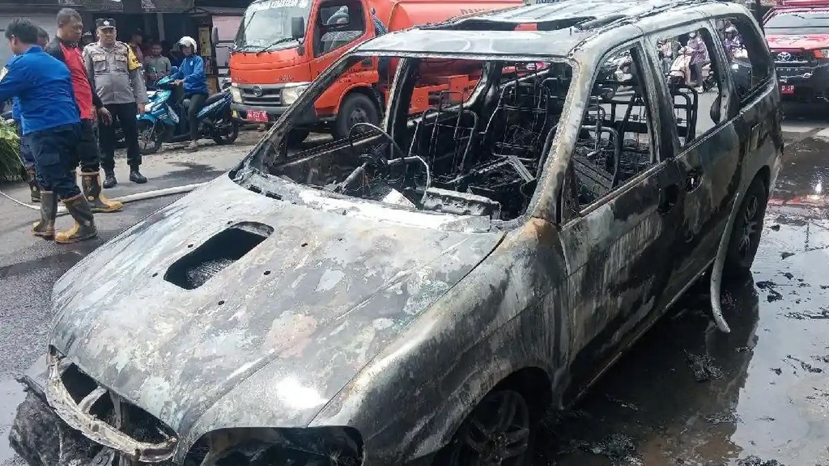 KIA Carnival terbakar habis oleh api dari luar dan dalam. Kekuatan api hanya meninggalkan dua ban belakang saja.