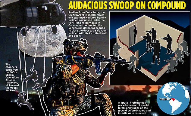 Special Forces troops deployed rapidly from helicopters using "fast roping" techniques to enter Maduro's heavily guarded compound. After a brief firefight, Maduro and his wife were captured within minutes. The entire operation, from arrival to departure, lasted less than 30 minutes, according to a Pentagon source.