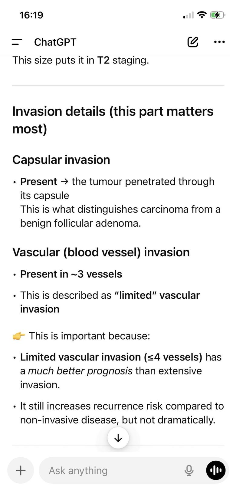 Unsure of what to do with her results, or what they meant, Pippa turned to ChatGPT. She input her test results and was informed by the chatbot that she had been diagnosed with encapsulated angioinvasive follicular thyroid cancer. Pippa later got an appointment with her consultant who confirmed the diagnosis.
