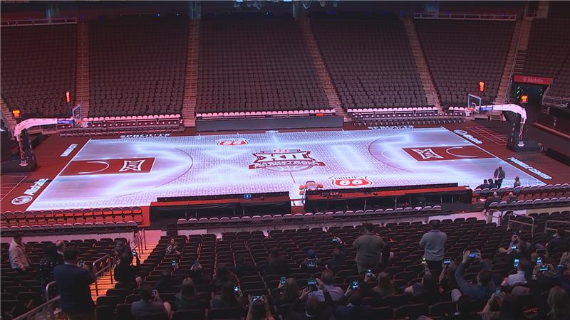 With just the touch of an iPad, the state-of-the-art floor offers a range of features. For the tournament, the court can change the teams represented, flash advertisements, and display player intros. Coaches can draw up plays on it, and the three-point arc glows when a deep shot is made. After a dunk in the paint, the glass "breaks" to create a visual effect. It is also easy to see where it's wet, and it maintains the same 'squeak' of shoes that fans enjoy in a basketball game. Fans can even participate in shooting games, adding an interactive element to the experience.