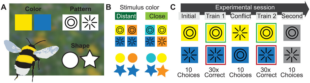 To determine how many features bumblebees store to identify good food sources, researchers trained the insects to associate specific combinations of traits with rewards. Artificial flowers with different color combinations were paired with either a pattern or a shape. For example, a blue, star-shaped flower might be rewarded with a sugar solution, while a yellow, round flower contained only water.
