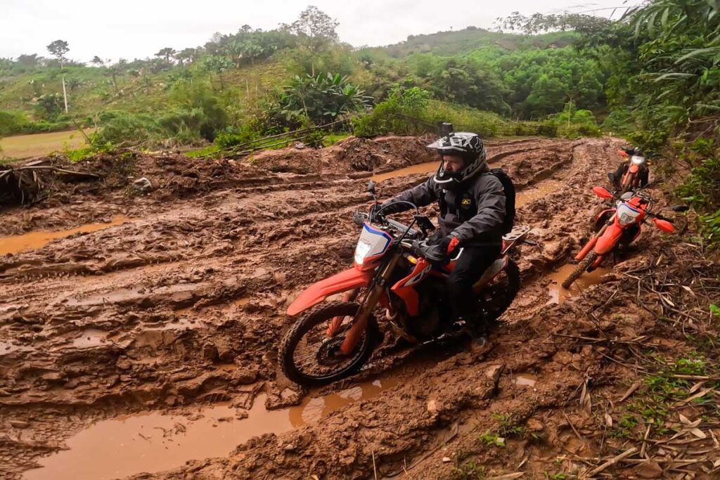 Mud changes daily. Shiny, reflective mud = slick like ice. Dull, matte mud = more grip. Puddles can hide ruts deep enough to eat a front wheel whole—look at the edges of puddles to judge depth. Fresh mud with no tire tracks?