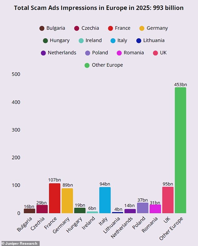 The UK saw the second-highest number of scam advert views in Europe, with 95 billion views in 2025, behind France’s 107 billion. This suggests that earnings from hosting scam adverts could reach £8.9 billion by 2030, with total impressions reaching 1.4 trillion in Europe.